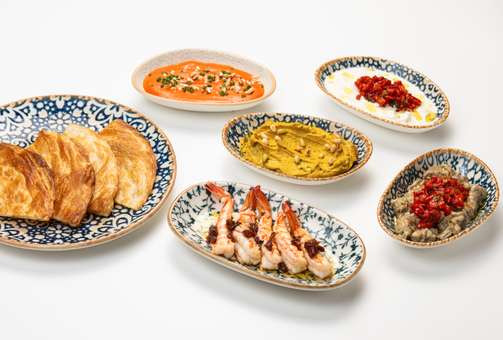 ENG: Assorted meze 5 tupes of meze with Roti Flatbread
